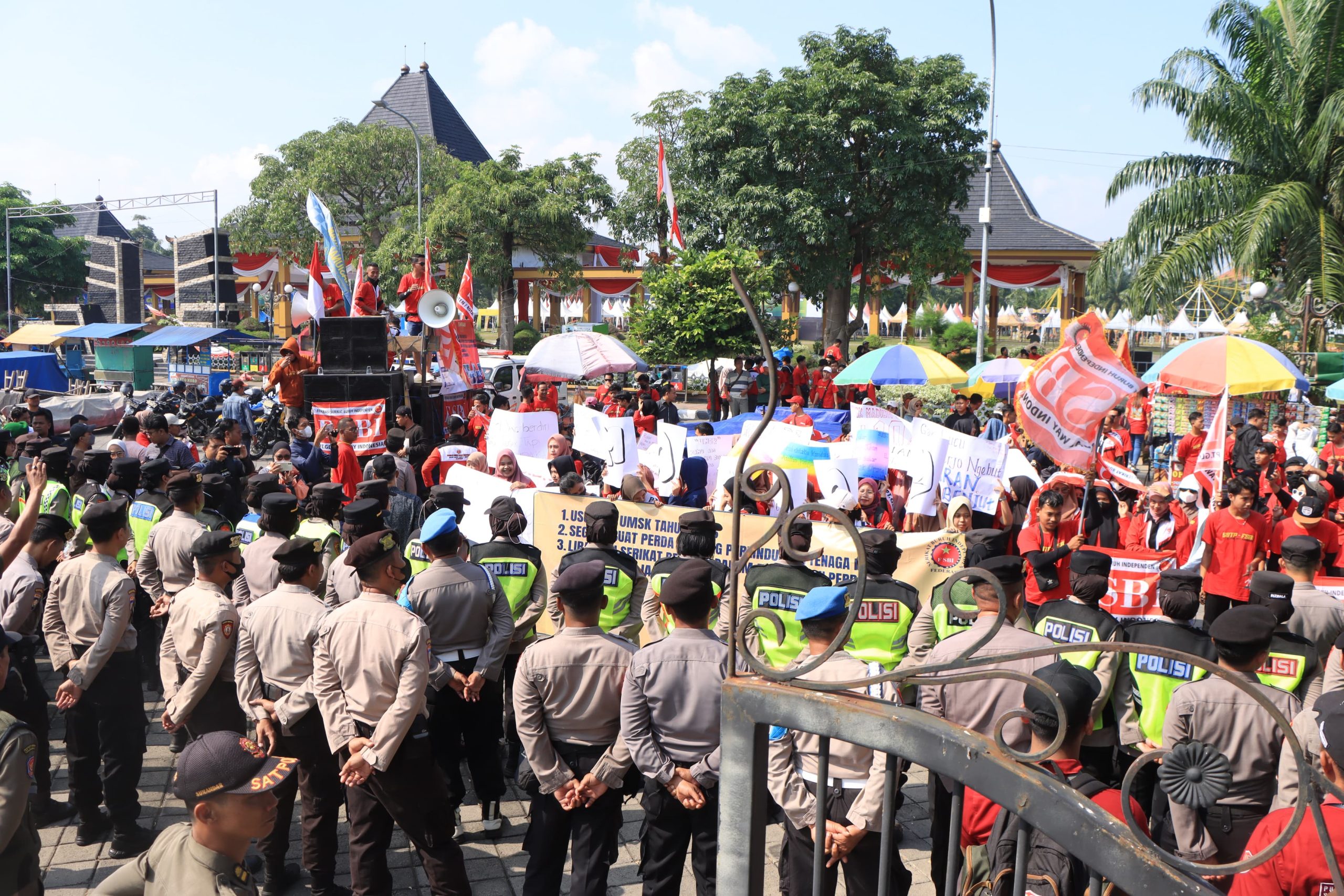 Aksi Damai yang diikuti kurang lebih 310 orang dari berbagai elemen serikat pekerja dan buruh diantaranya SBMR (Serikat Buruh Madiun Raya) dan FSBI Madiun (Federasi Serikat Buruh Independen) berlangsung dengan tertib, damai, dan kondusif.