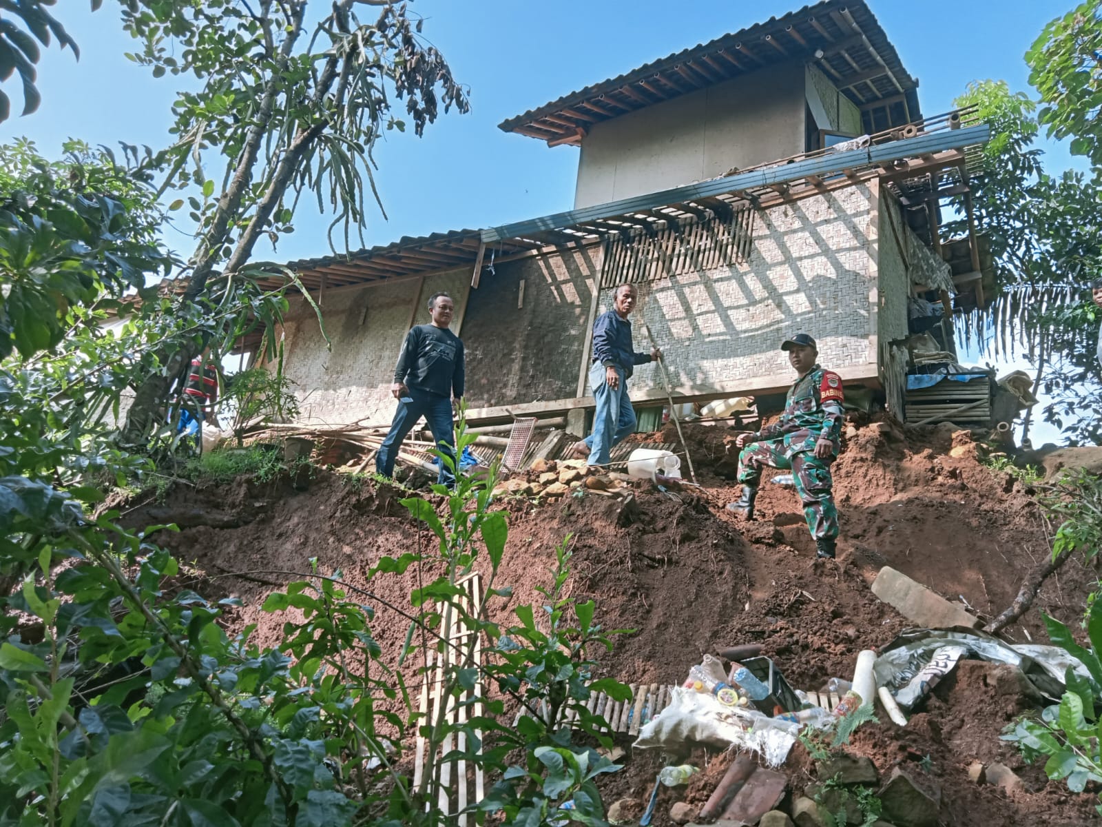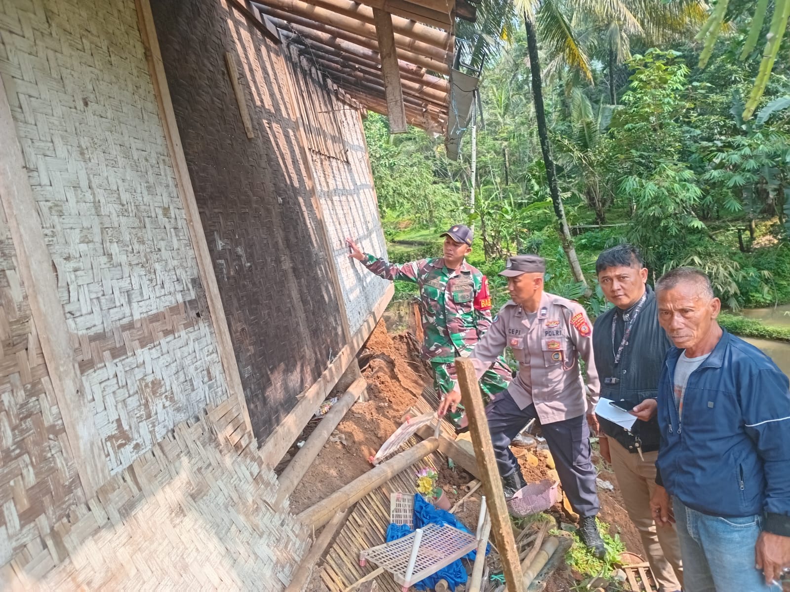 Berdasarkan hasil pengecekan lapangan yang dilakukan pada Minggu pagi (11/5/2025) sekitar pukul 09.00 WIB, tanah longsor menyebabkan bagian dapur rumah panggung milik Sdri. Hotimah mengalami kerusakan cukup parah. Longsoran tanah dengan panjang 12 meter dan tinggi 5 meter itu terjadi di bagian belakang rumah korban.