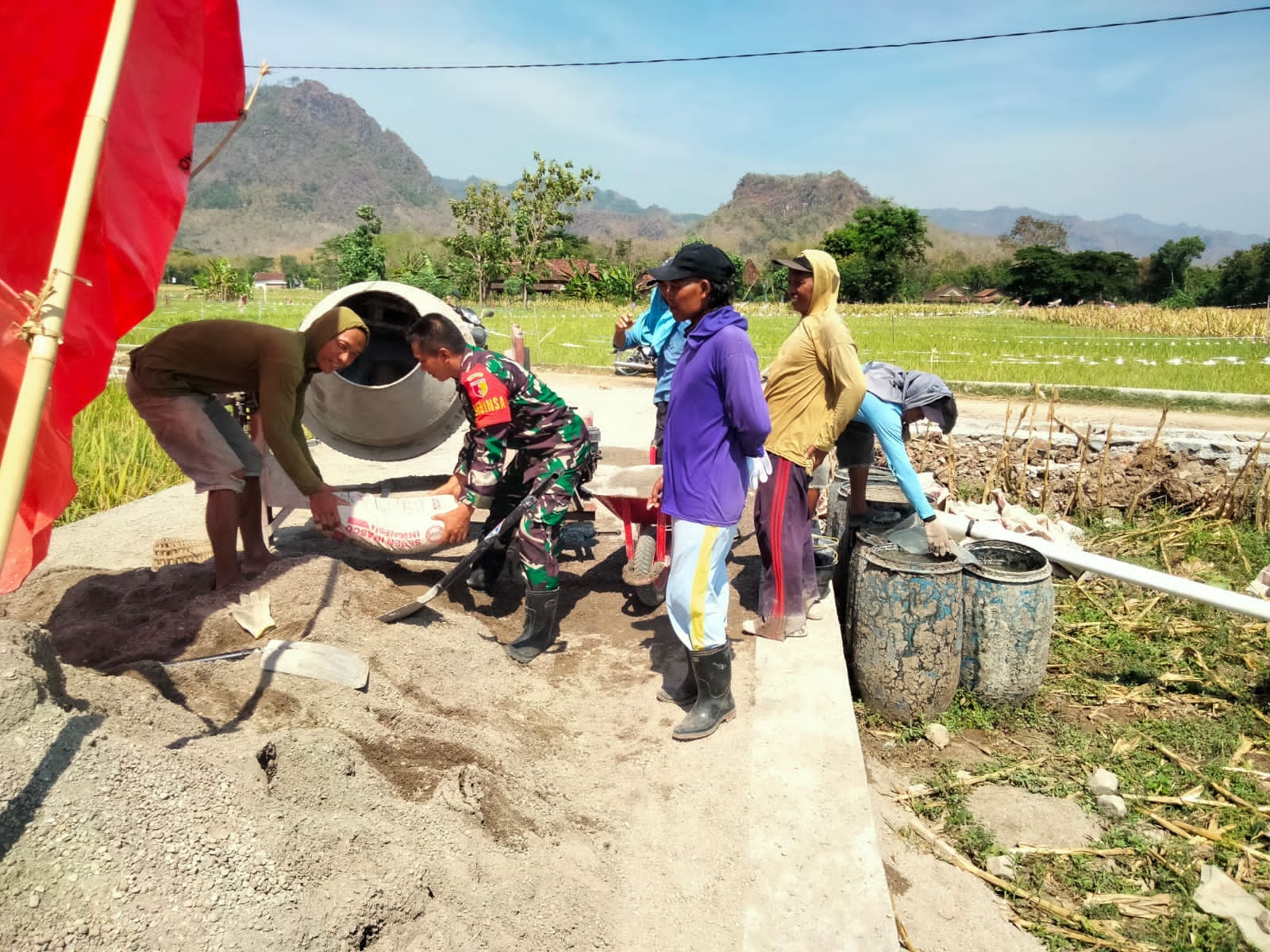 Berbaur bersama warga Desa Slahung, dia melaksanakan kegiatan pembangunan jalan di area sawah yang ada di desa tersebut. ” Hari ini kami bersama warga Desa Slahung melaksanakan kerja bakti membangun jalan di area sawah, ” kata Sertu Andik dihubungi Media Center 0802.