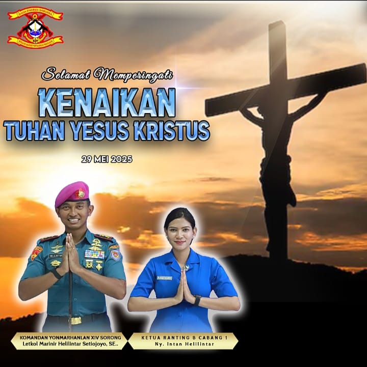 KOTA SORONG PBD, BUSERJATIM.COM GROUP (31/5/25) – Komandan batalion marinir pertahanan pangkalan Danyonmarhanlan XIV Sorong, Letkol Mar Helilintar setyojono Laksono SE, bersama staf dan keluarga mengucapkan selamat hari Kenaikan Isa Al-masih adalah peristiwa yang terjadi 40 hari setelah Kebangkitan Yesus. Seperti yang dicatat dalam bagian Perjanjian Baru pada Alkitab umat Kristiani, Yesus Kristus terangkat naik ke langit untuk memasuki kerajaannya. Walau berbeda dalam konteks dan waktu, oleh karena Paskah dan Kenaikan Isa Almasih yang sesungguhnya saling berkaitan. Dimana Paskah biasanya dirayakan pada hari Minggu pertama setelah purnama penuh yang jatuh di sekitar akhir Maret. Sedangkan Kenaikan Isa Almasih diperingati 40 hari setelah Paskah, dan selalu jatuh pada hari kamis.
