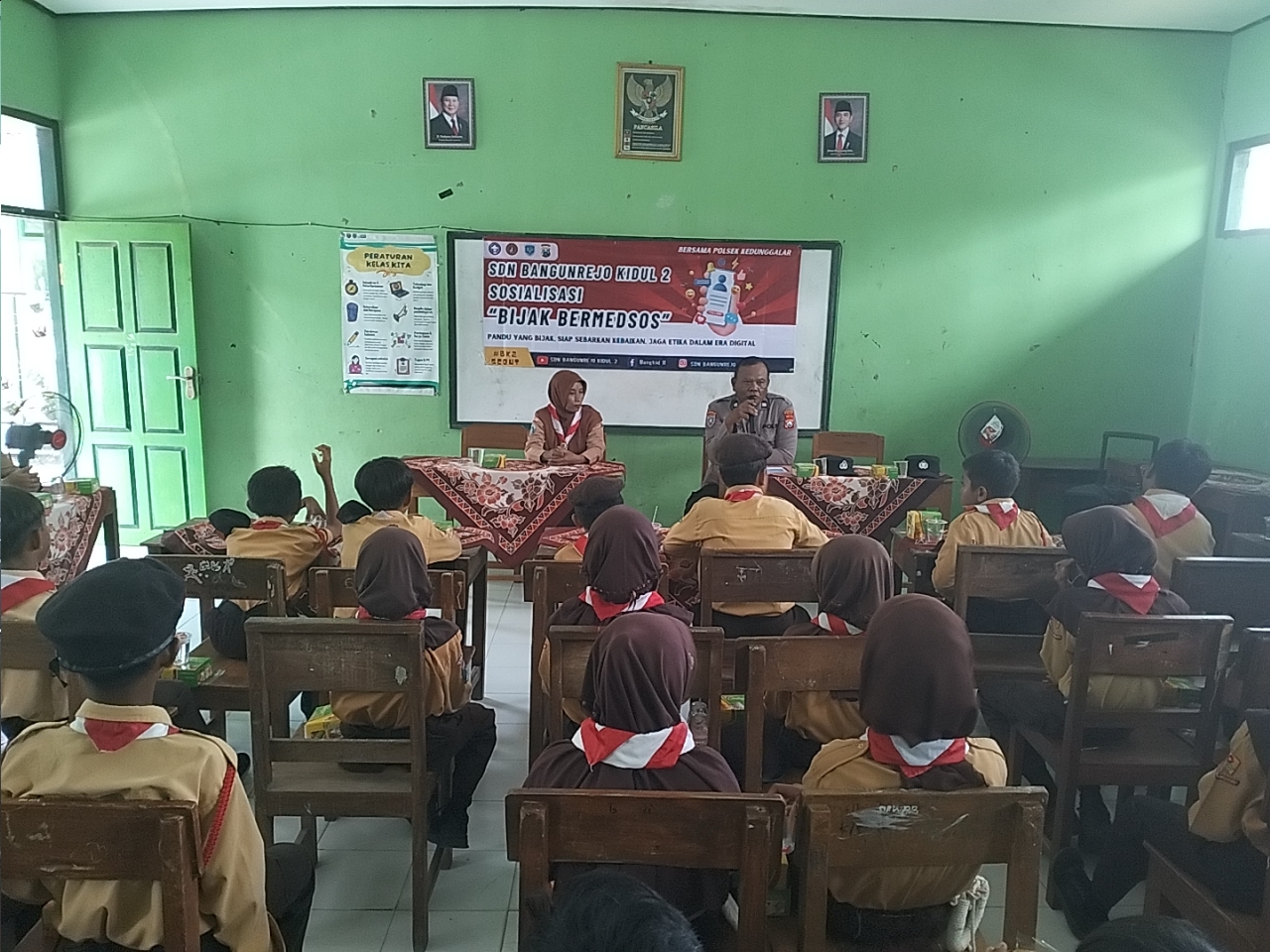 Kapolsek Kedunggalar, AKP Karno, S.H., bersama anggotanya diterima oleh Hartiti, S.Pd. selaku Kepala Sekolah SDN Bangunrejo Kidul dan seluruh siswa-siswi SDN Bangunrejo Kidul 2.