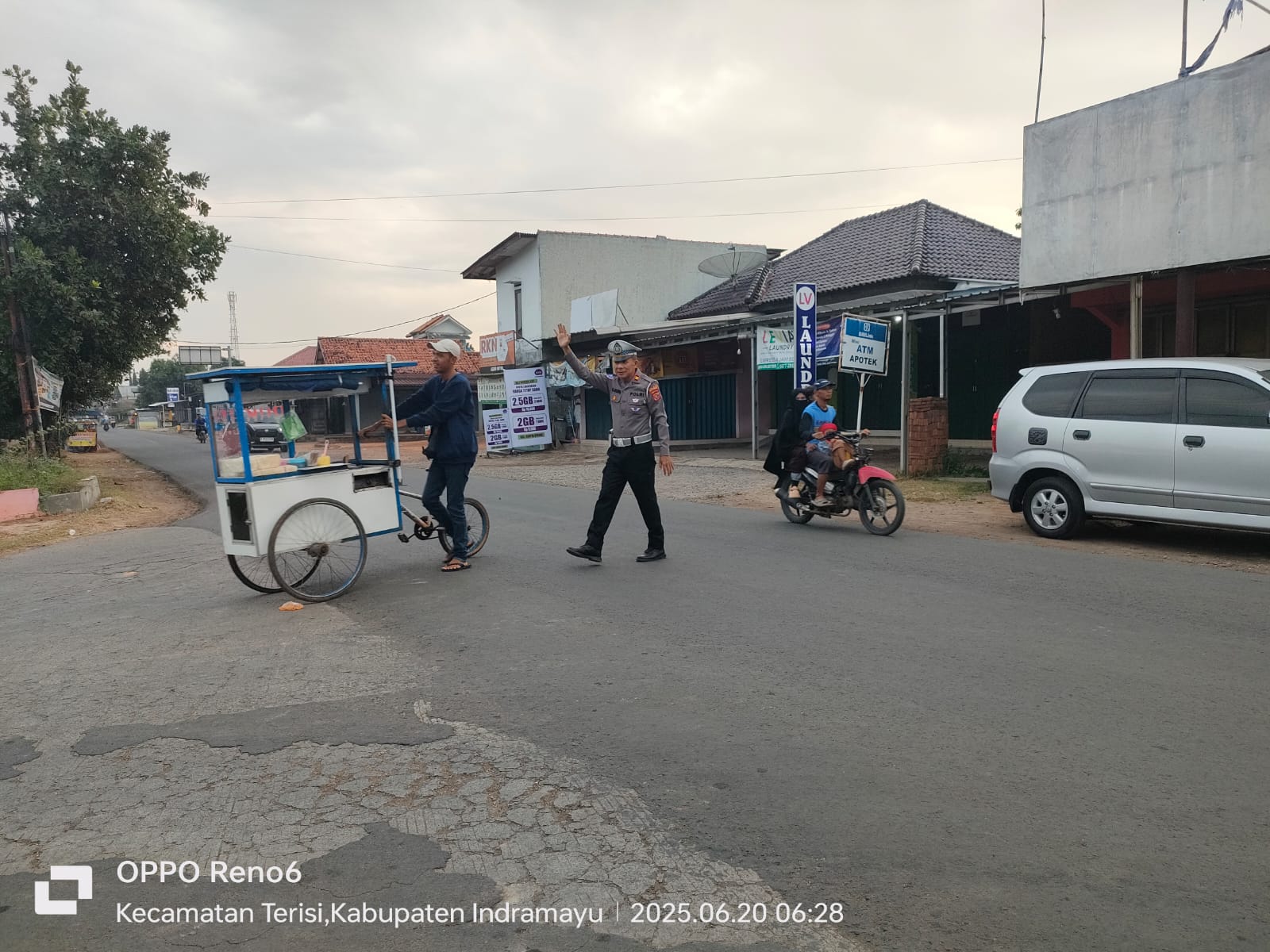 Indramayu,— Unit lalu lintas Polsek Terisi jajaran Polres Indramayu Polda Jabar melaksanakan kegiatan pengaturan lalu lintas pagi, di jalan raya depan SMPN 1 Terisi, Kecamatan Terisi, Kabupaten Indramayu, Jum’at (20/6/2025).