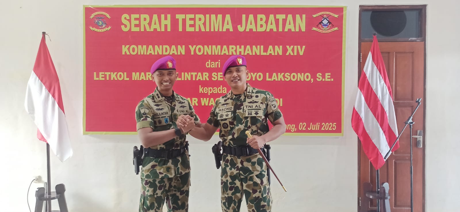 KOTA SORONG PBD, BUSERJATIM.COM GROUP — Tongkat komando Komandan Batalyon Marinir Pertahanan Pangkalan (Yonmarhanlan) XIV resmi berganti. Dalam upacara yang berlangsung khidmat di Mako Yonmarhanlan XIV, Jalan Gunung Arfak, Kampung Baru, Distrik Sorong Kota, Rabu (2/7/25), Letkol Mar Helilintar Setiojoyo Laksono, S.E. menyerahkan jabatan kepada penggantinya, Mayor Mar Wachid Purwadi.