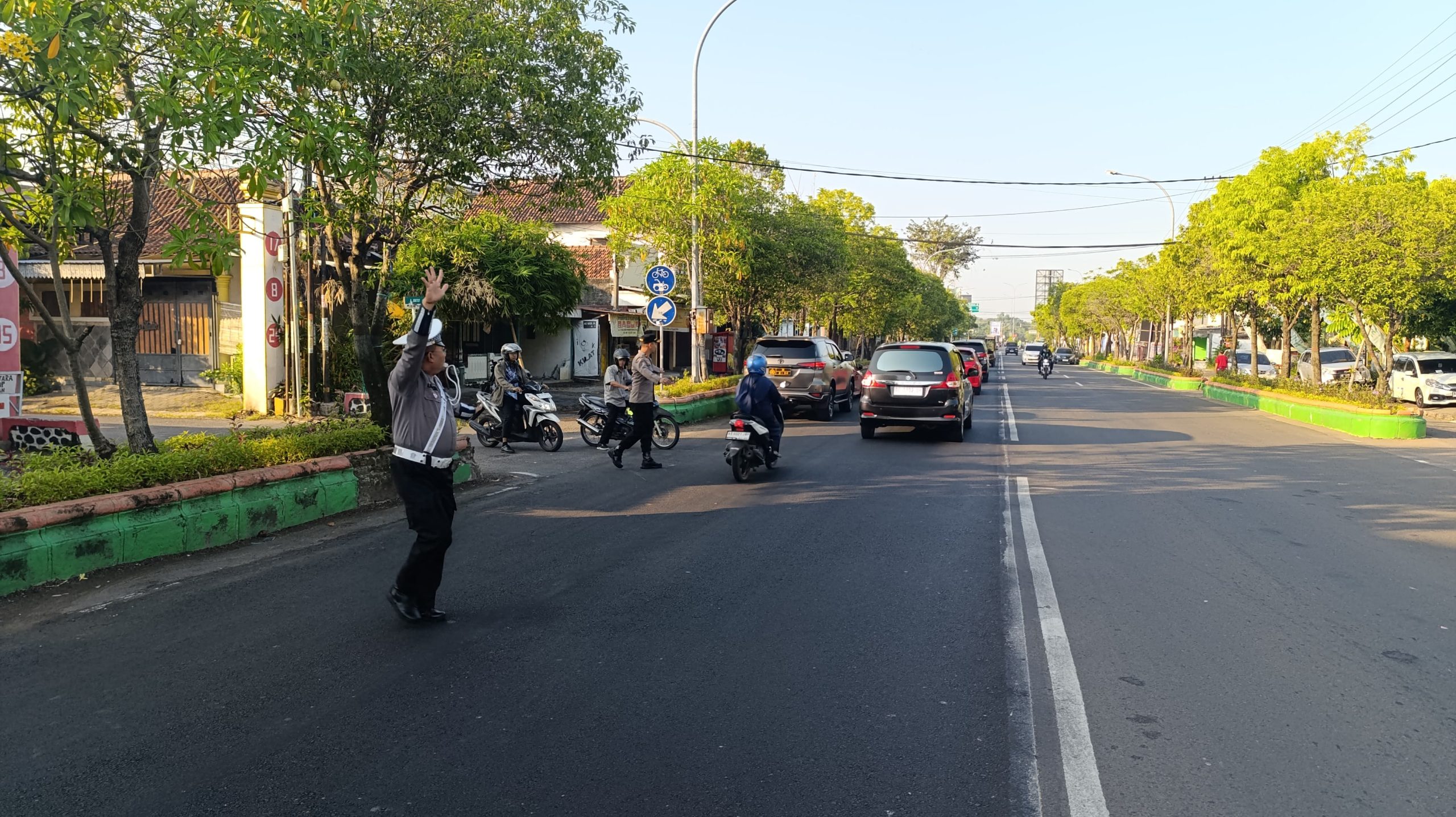 Selain penampilan pagi, mengatur arus lalu lintas di jalan raya, anggota Polres Ngawi juga memberikan imbauan kepada masyarakat untuk selalu mematuhi aturan lalu lintas.