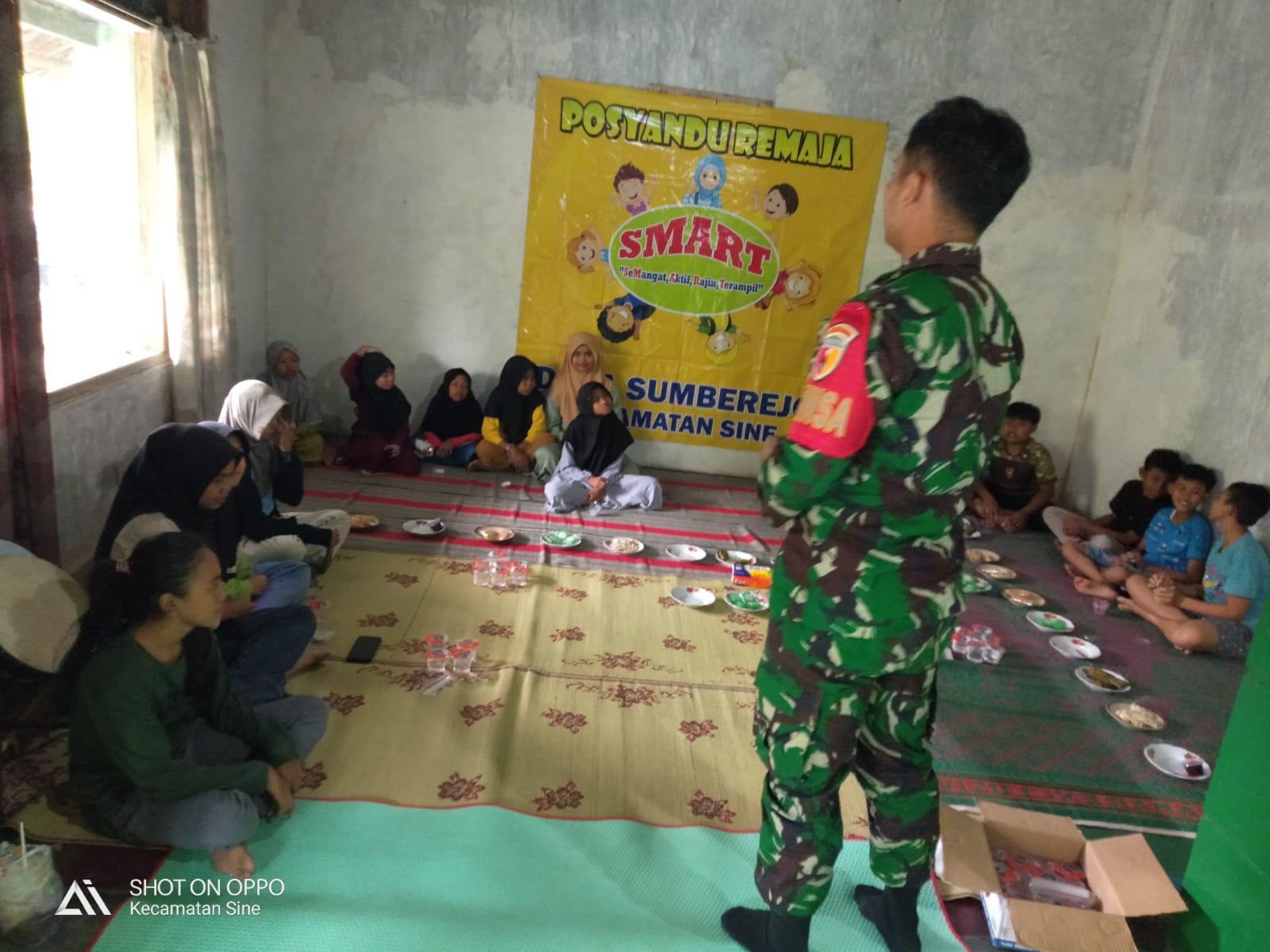 NGAWI, BUSERJATIM.COM GROUP – Babinaa Koramil Sine Kodim 0805 Ngawi, Serda Yusuf bahtiar bersama bidan Desa memberikan arahan dan edukasi tentang pertumbuhan remaja dalam kegiatan Posyandu Remaja dilaksanakan di rumah ibu kader pkk desa sumberejo, kecamatan Sine, kabupaten Ngawi. Kamis (7/8/2025).