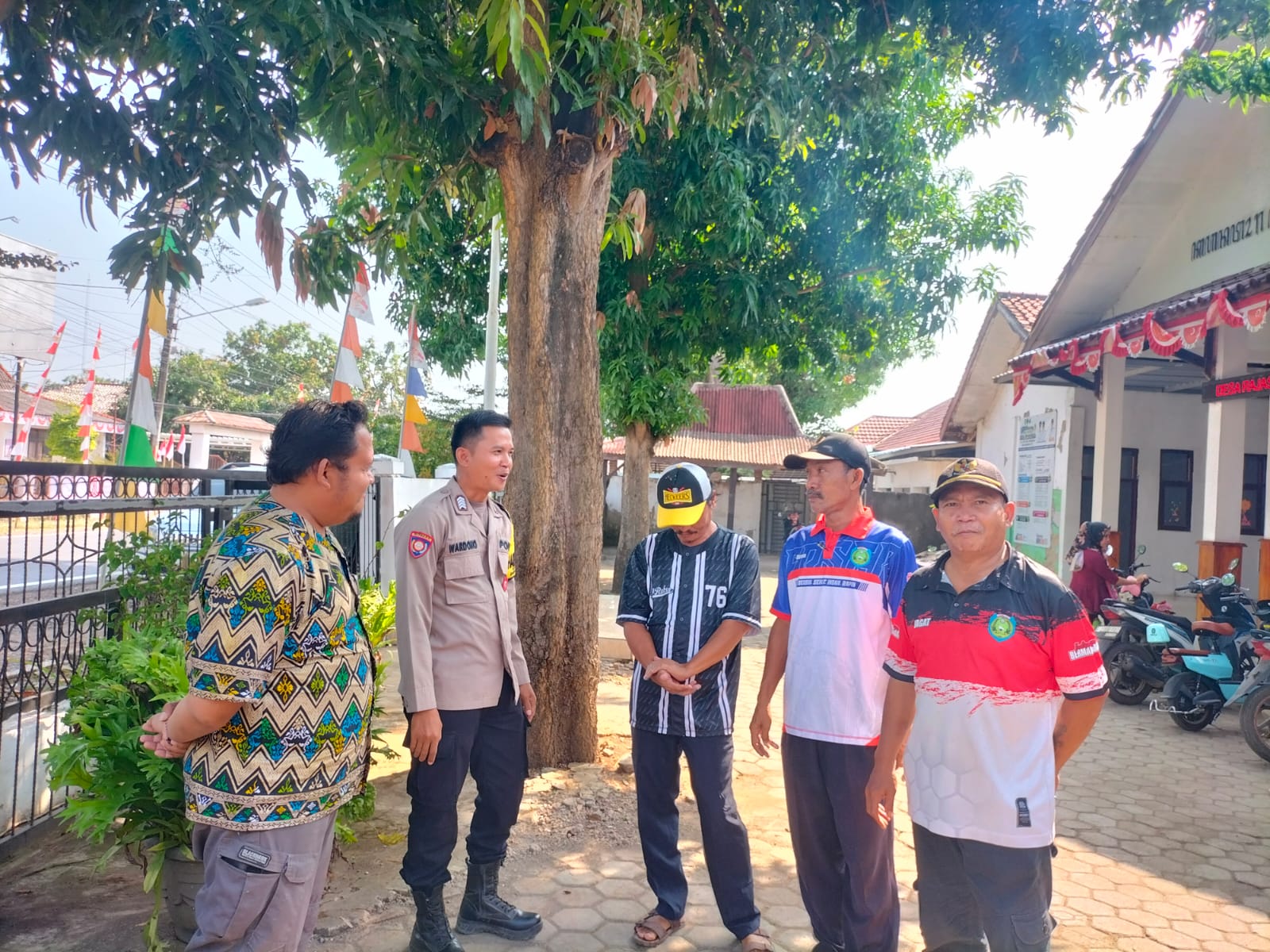 Indramayu – BRIPKA Dono Wardono, Bhabinkamtibmas Polsek Terisi, Polres Indramayu Polda Jabar duduk berdiskusi dengan sejumlah warga.