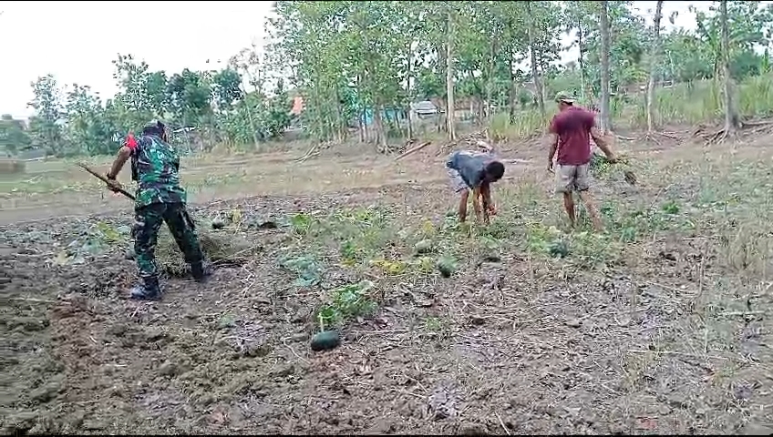 NGAWI, BUSERJATIM.COM GROUP – Bintara Pembina Desa (Babinsa) Koramil 0805/15 Karanganyar Kodim 0805/Ngawi Sertu Maryono membantu masyarakat pengolahan lahan jagung di lahan milik Bpk Sumiran warga Dusun Bedug Desa Sriwedari Kecamatan Karanganyar Kabupaten Ngawi, Sabtu (06/9/2025).
