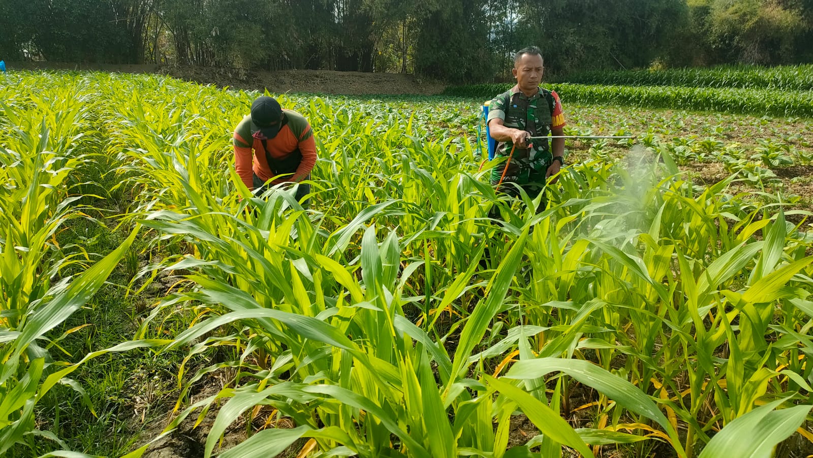 PONOROGO,BUSERJATIM.COM GROUP,-Warga di wilayah desa binaan sedang melakukan penyemprotan hama tanaman jagung, Serka Haryono langsung beraksi (aktif) membantu melakukan aktivitas tersebut, Sabtu (25/10/2025).