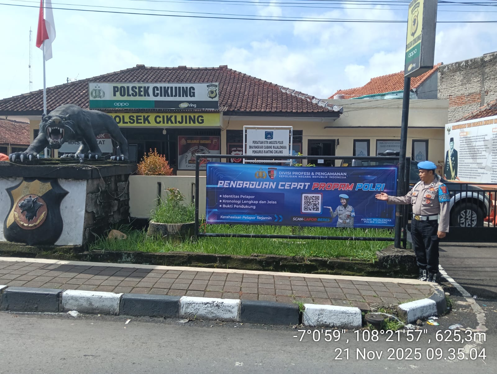 Majalengka – Ps. Panit Provost Polsek Cikijing Polres Majalengka Polda Jabar Aiptu Memen Suparman, S.H. melaksanakan pemasangan spanduk informasi pengaduan cepat Propam Polri di depan kantor Mapolsek Cikijing, Jum’at (21/11/2025).