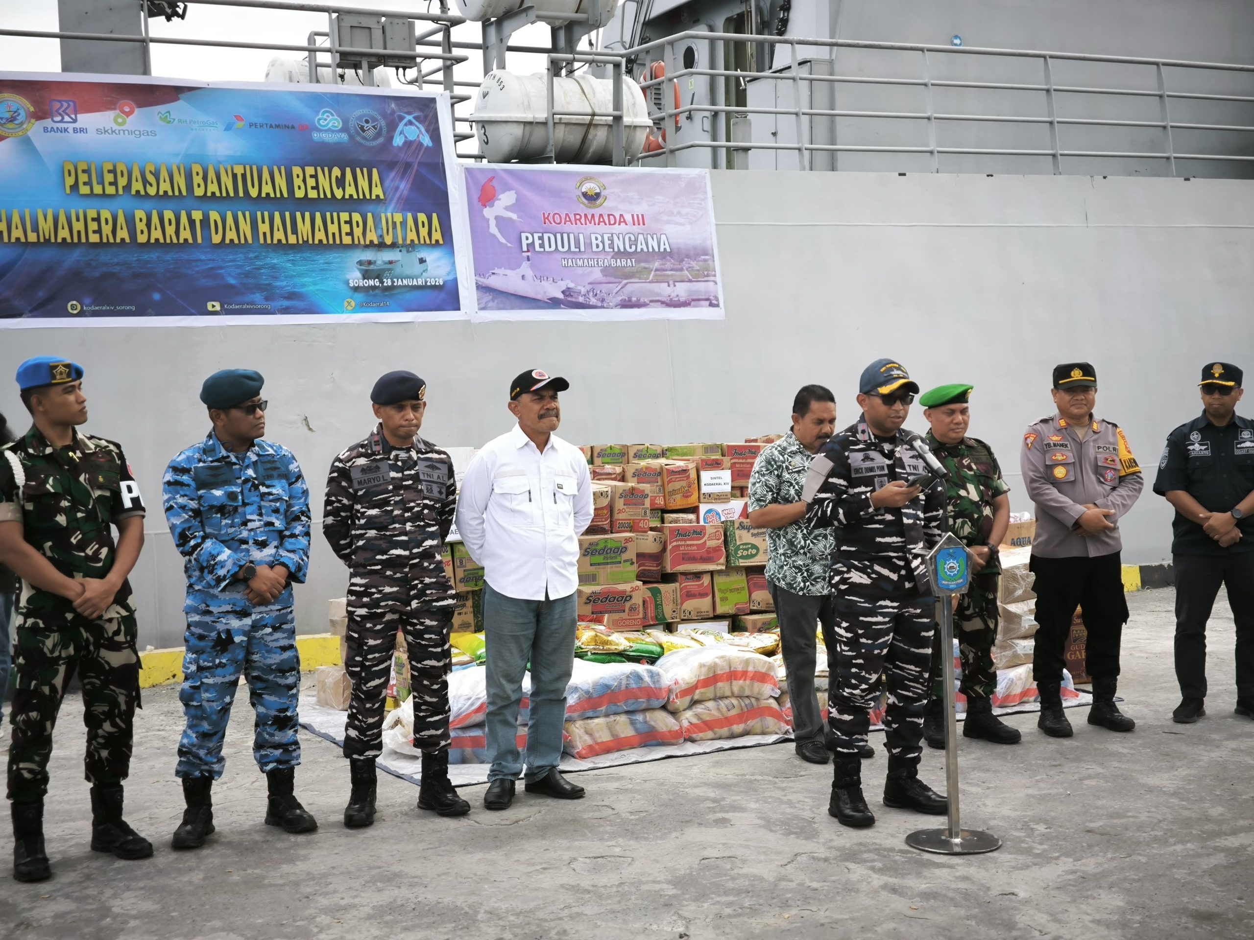 Pendistribusian bantuan dilaksanakan di Pelabuhan Tobelo dan diterima secara langsung oleh pejabat Forum Koordinasi Pimpinan Daerah (Forkopimda) setempat. Selanjutnya, bantuan tersebut akan disalurkan kepada masyarakat yang membutuhkan di wilayah terdampak banjir bandang.