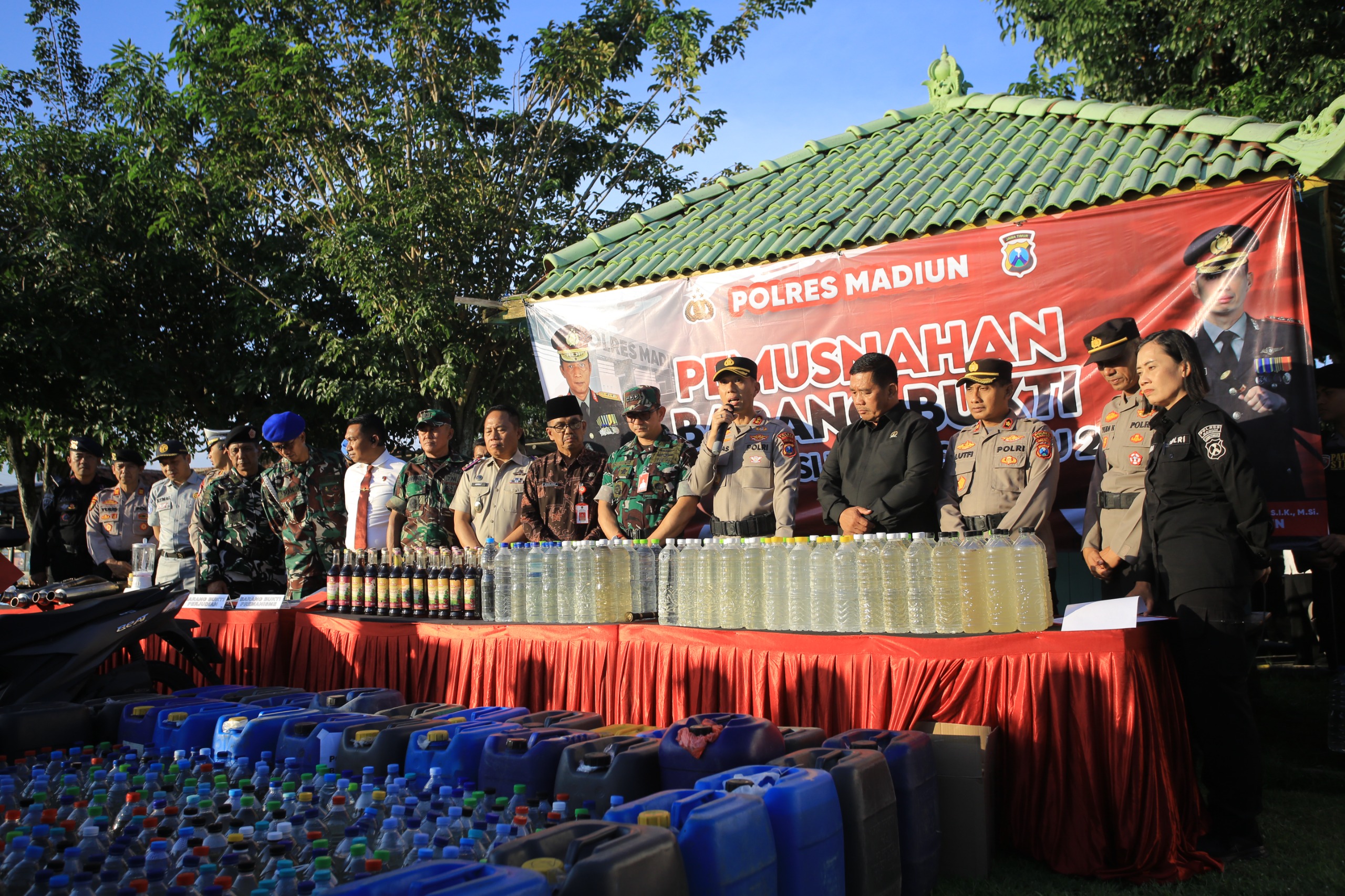 Selain ribuan liter miras dan puluhan gram sabu, petugas juga menyita berbagai barang bukti pendukung lainnya seperti sepeda motor (Honda Beat dan Yamaha N-Max), senjata tajam, serta alat komunikasi.